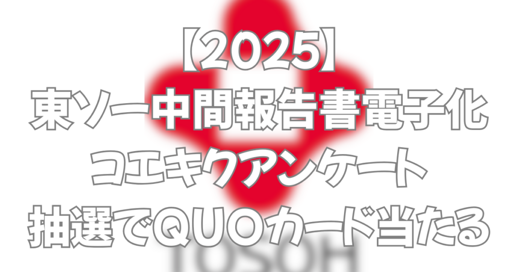 東ソー株式会社(4042)は2025年12月、中間報告書ウェブ掲載の案内とともに、アンケート協力のお願いがありました。株主投資主向けアンケートサービス「コエキク」が提供するアンケートに回答した株主の中から抽選で薄謝が進呈されるようです。抽選の割合... -