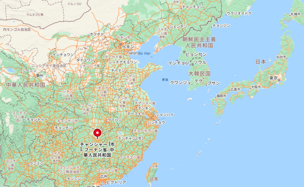 長沙は、中国中南部に位置する湖南省の省都です。地図はだいたいこんな位置。